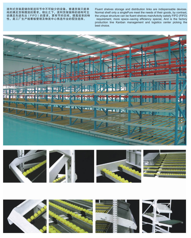 流利式貨架廣泛應(yīng)用于制造業(yè),商業(yè),配送中心,裝配車間以及出貨頻率較高的倉(cāng)庫(kù)流利式貨架:采用輥輪鋁合金,鈑金等流利條,利用臺(tái)架自重實(shí)現(xiàn)先進(jìn)先出,存儲(chǔ)方便,適用于裝配線兩側(cè)配送中心等場(chǎng)所。